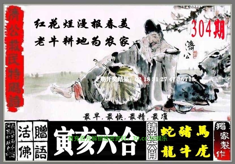 | 304期:济公特码诗 红花烂漫报春美,老牛耕地为农家。 解:牛猪鸡羊狗马。 活佛赠语:【寅亥六合】 解:虎猪 七肖:牛猪鸡羊狗马虎 |