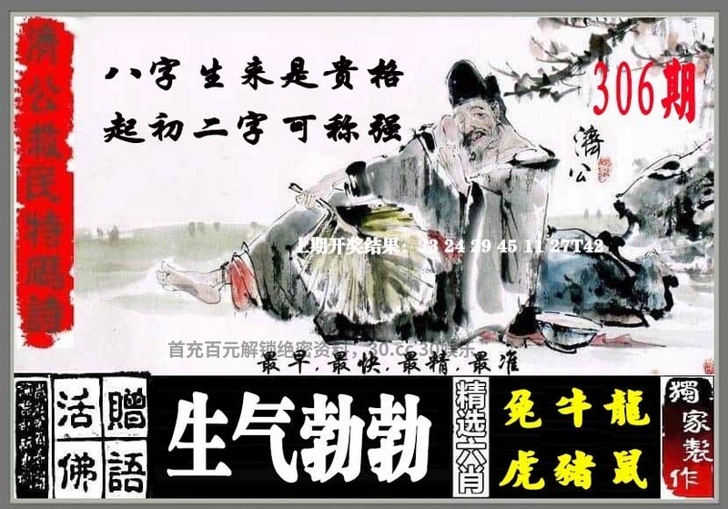| 305期:济公特码诗 曾经沧海难为水,春光美好猪蛇牛。 解:猪蛇牛虎兔龙。 活佛赠语:【稀里哗啦】 解:鼠猪 七肖:猪蛇牛虎兔龙鼠 |